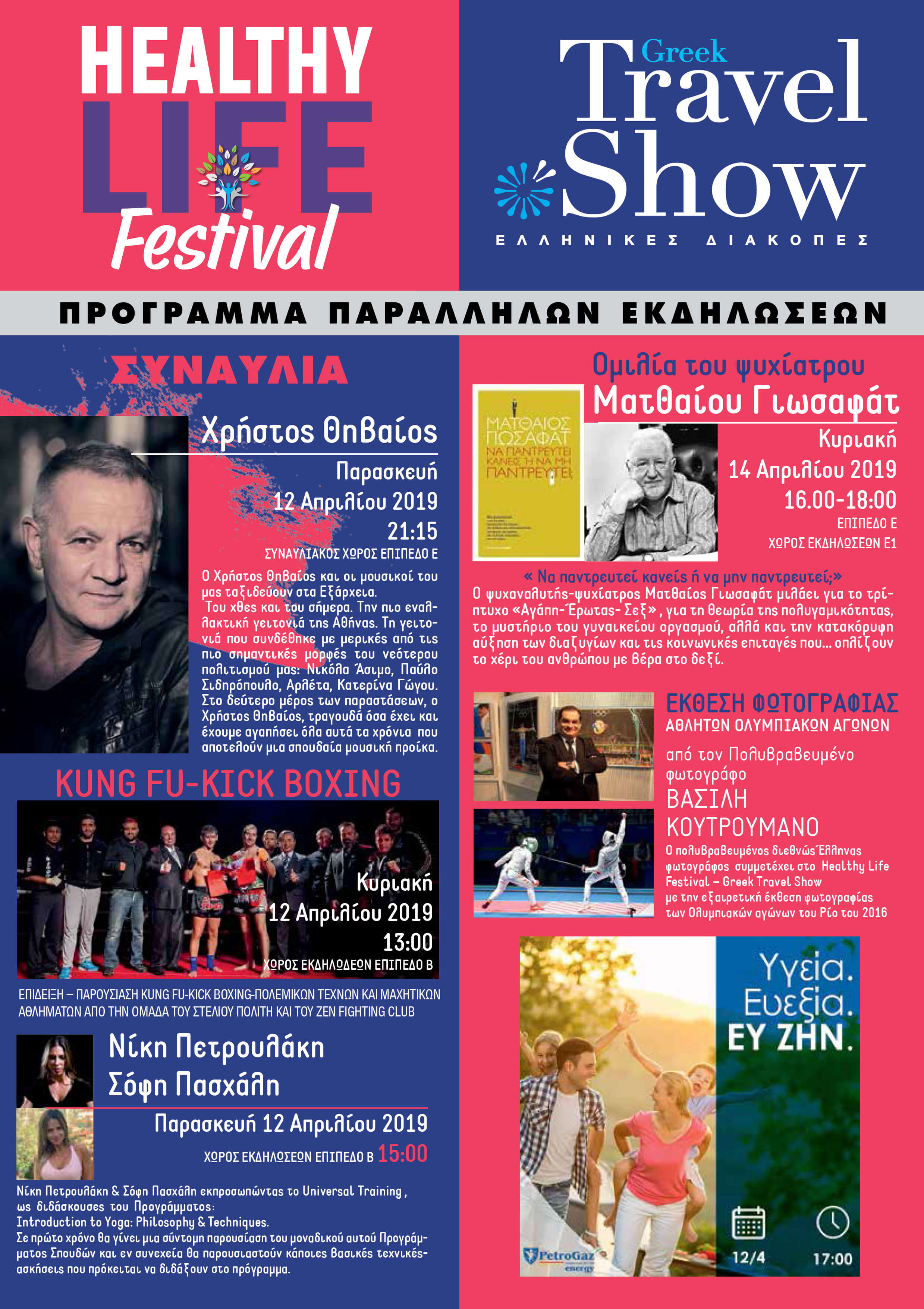 Πλαισιωμένοι από τα μονοπάτια γνώσης για την υγεία, την ευζωία, τη μακροβιότητα, την ιαματική ιατρική, την βοτανολογία, την έρευνα, την ανάπτυξη, τον πολιτιστικό και εναλλακτικό τουρισμό, οι επισκέπτες του Healthy Life Festival – Greek Travel Show, θα έχουν την ευκαιρία να γνωρίσουν υπηρεσίες, πληροφορίες, προϊόντα και μεθόδους ευζωίας, διατροφής, χαλάρωσης και διάθεσης ελεύθερου χρόνου και διακοπών, που θα βελτιώσουν τον τρόπο ζωής τους και θα εξισορροπήσουν την υγεία τους τόσο σε σωματικό όσο και σε ψυχικό επίπεδο.